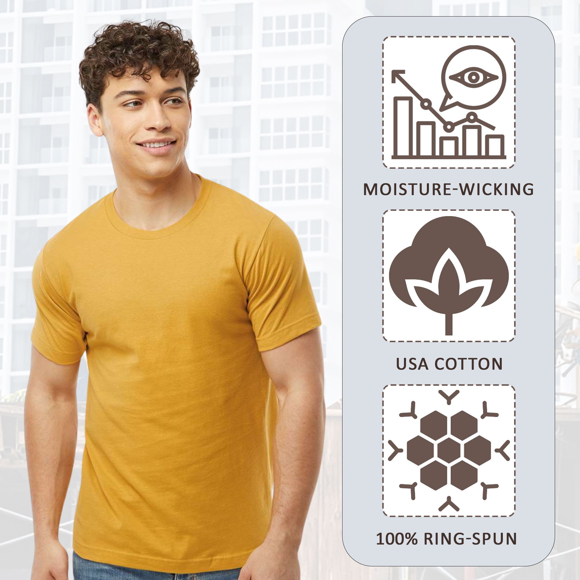 - 4.5 oz./yd², pre-shrunk 100% ring-spun USA premium cotton, 30 singles